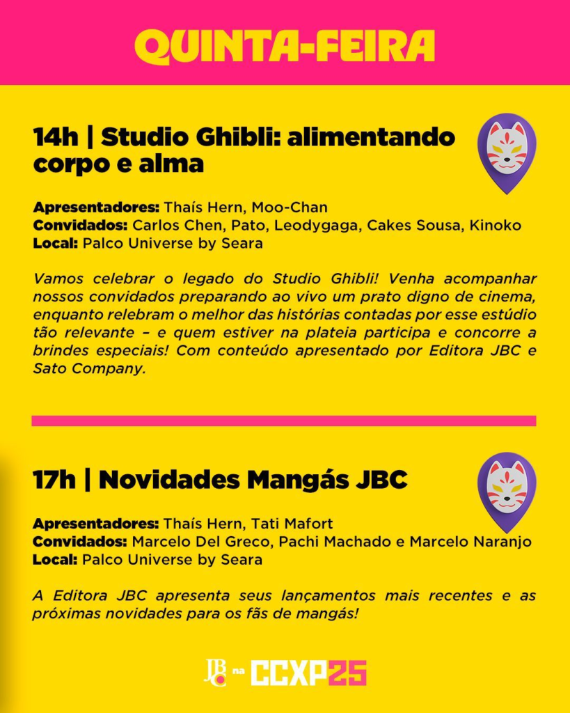 Já às 17h, é hora de mergulhar nas novidades da Editora JBC, referência absoluta quando o assunto é mangá no Brasil. Com apresentação de Thaís Hern e Tati Mafort, e participação de Marcelo Del Greco, Pachi Machado e Marcelo Naranjo, o painel promete revelar lançamentos aguardadíssimos e anúncios fresquinhos que vão agitar os fãs.