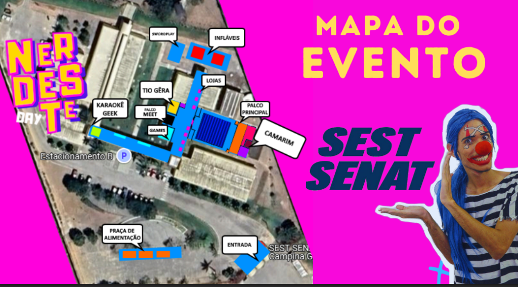 O SEST SENAT vai se transformar em um verdadeiro parque geek, com cada espaço pensado para oferecer diversão e interação. Do Karaokê Geek ao Swordplay, passando pelos Games, Lojas temáticas, Palco Meet e o Palco Principal, o público vai encontrar atividades para todos os gostos. A Praça de Alimentação garante energia para aproveitar o dia inteiro, enquanto os infláveis e o espaço do Tio Gêra trazem diversão para todas as idades.