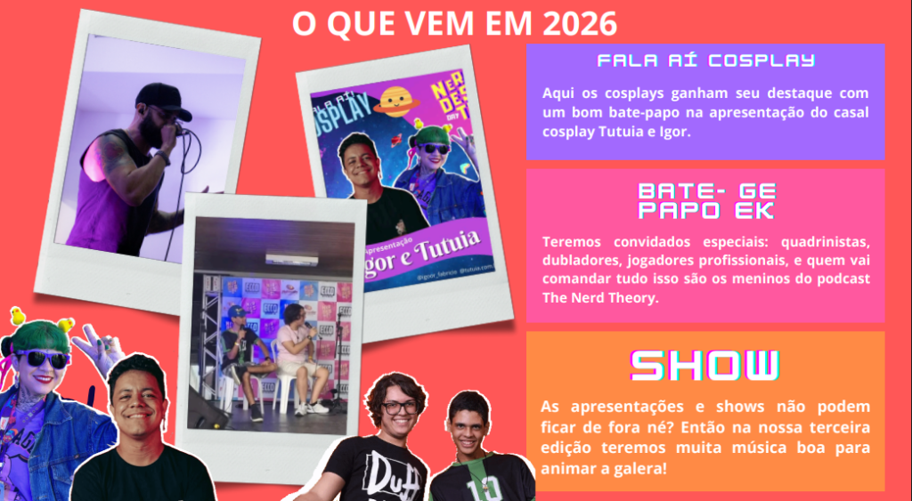 O Nerdeste é mais do que um evento: é um movimento que nasceu em meio à pandemia, quando a distância os fizeram buscar novas formas de conexão. O projeto começou como um canal para divulgar o universo geek e rapidamente se transformou em uma referência cultural. De Campina Grande a João Pessoa, de Recife a Natal, o Nerdeste cresceu com a força e a criatividade de uma comunidade apaixonada por games, cosplay, quadrinhos, música e tudo que envolve o mundo nerd.